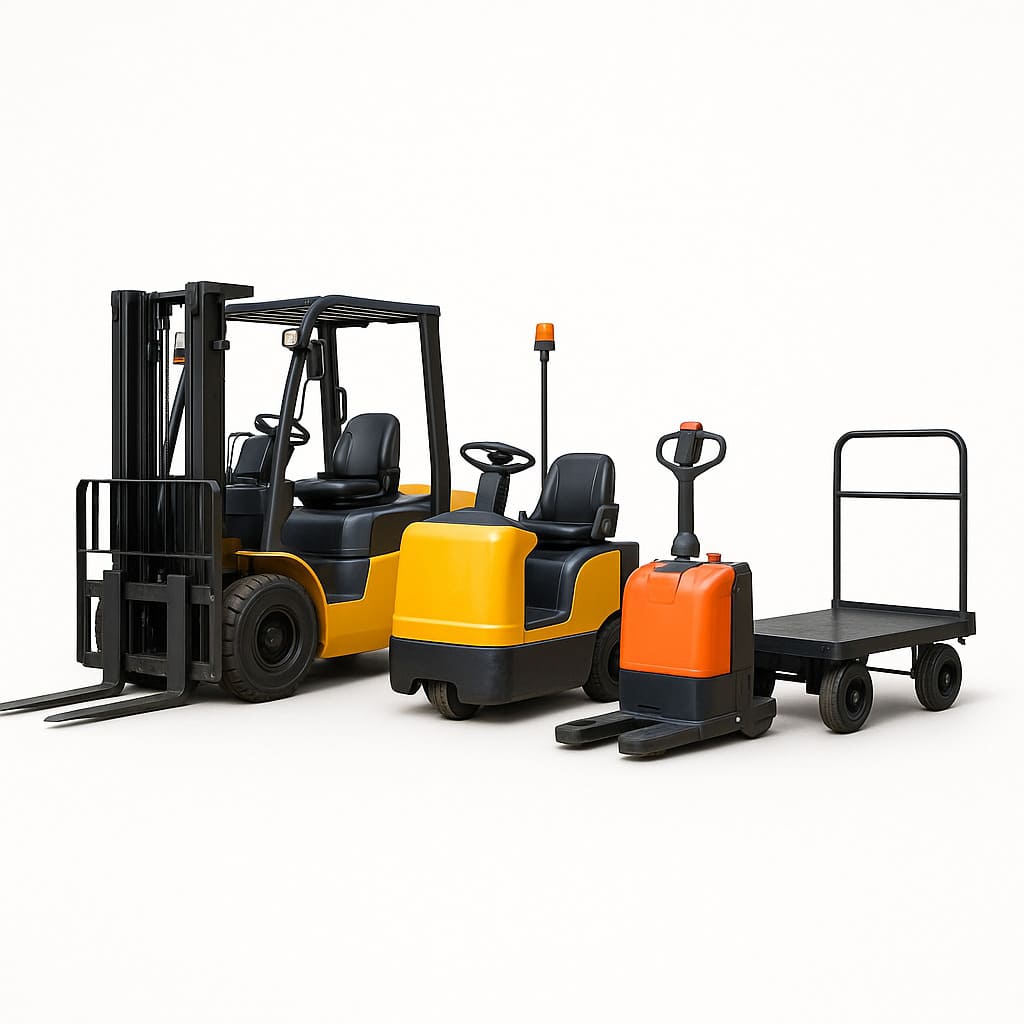 Разбираем, какой тип техники используется: электропогрузчики, тягачи, производственные тележки, AGV/AMR, самоходные платформы. Фиксируем грузоподъёмность, тип привода, батареи, наличие кабины, систем управления и безопасности.