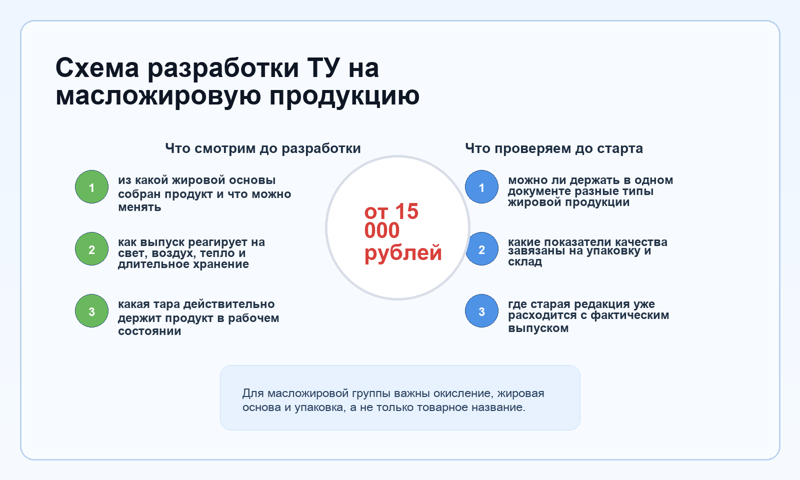 В ТУ мы закрепляем допустимую жировую основу, логику переработки, параметры качества, требования к таре и складскому режиму. Важна именно связка между этими блоками: почему продукт в такой упаковке и при таком хранении действительно сохраняет нужные свойства весь заявленный срок.
